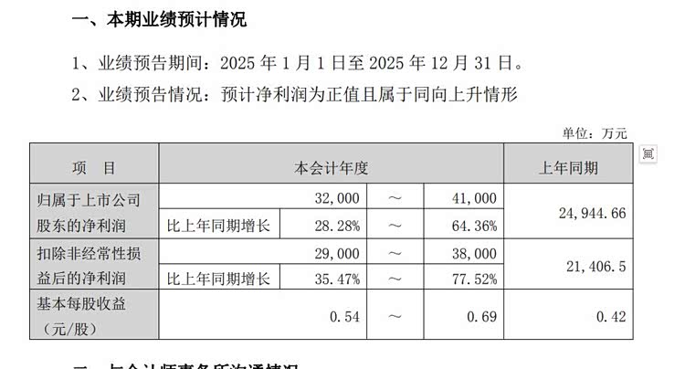 公告显示,公司2025年度预计归母净利润为3.2亿元-4.1亿元,同比增长28.28%-64.36%;扣除非经常性损益净利润约2.9亿元-3.8亿元,同比增长35.47%-77.52%。