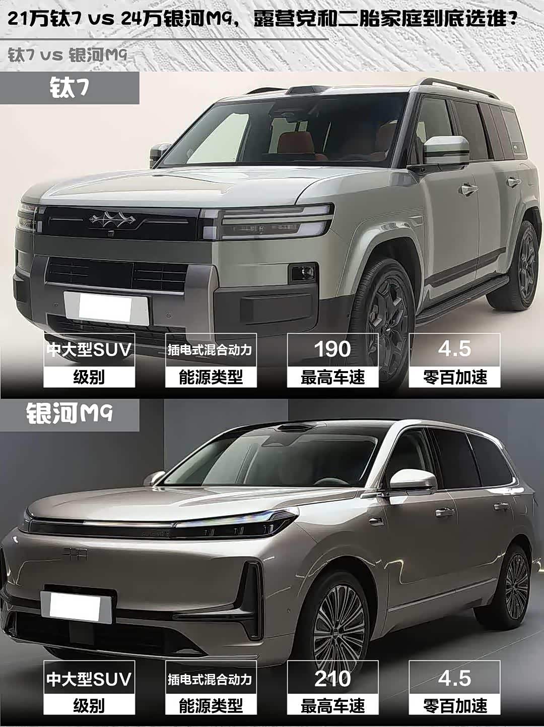 车家号·0浏览·2026-03-17 08:17 · 北京最近在选车的小伙伴看过来!今天深度对比两款热门插混SUV——钛7 2025款 190KM四驱Ultra版和 银河M9(参数|询价) 2025款 210km四驱领航版,实测干货分享给你们👇