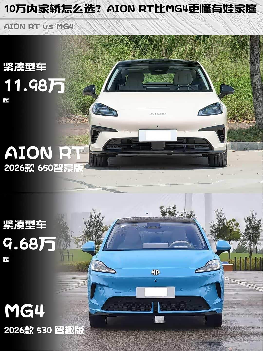 最近在选纯电家轿的朋友看过来!今天深度对比两款热门车型—— AION RT(参数|询价) 2026款 650智豪版和MG4 2026款 530智趣版,帮你理清需求不踩坑✨
