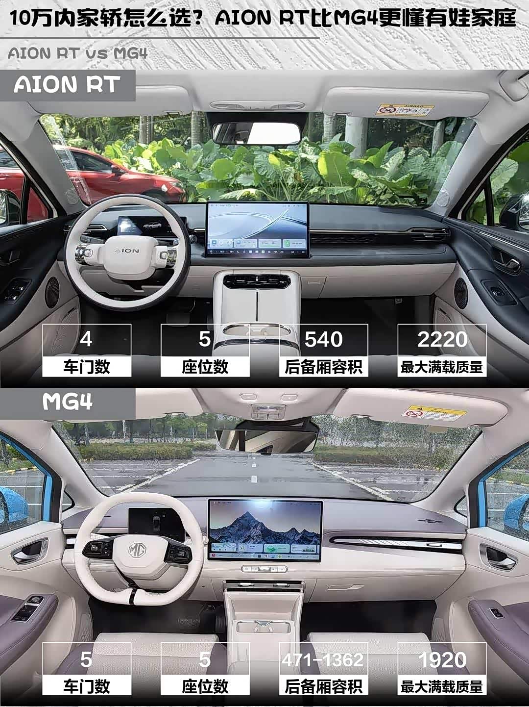 AION RT三厢设计+540L后备箱,婴儿车+露营装备轻松装。MG4两厢造型更灵活,后排放倒能拓展到1362L,但头部空间稍局促。实测AION RT后排坐1米8大个子还有两拳腿距,MG4后排地台全平,三人乘坐更友好。要家用大空间选AION RT,要灵活装载选MG4🚗