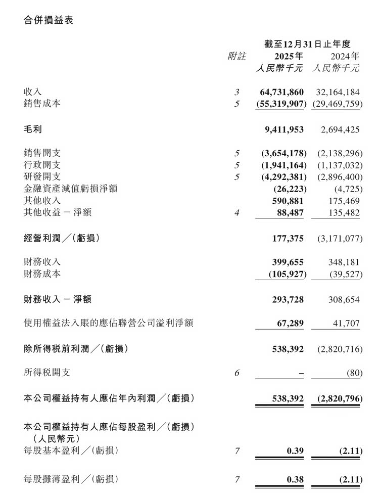 2025年,零跑汽车总收入为人民币647.3亿元,同比增长101.3%。其中,电动汽车及部件销售收入为620.1亿元,较2024年的316.3亿元增长96.0%;来自服务及其他销售的收入为27.2亿元,较2024年的5.3亿元大幅增长413.2%,该增长主要由于海外整车销量大幅增长,带动相关碳积分交易收入的增加。