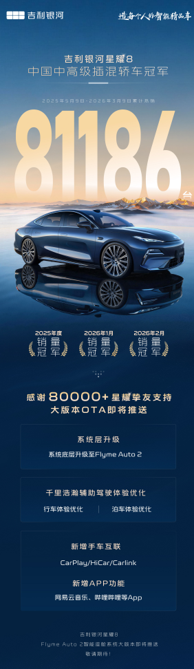 当一辆车的机械素质已经足够优秀,接下来的比拼便转入无形赛道——智能科技。对于当下消费者而言,车机卡不卡、语音聪不聪明、辅助驾驶好不好用,直接决定了每天的出行心情。吉利银河星耀8能在2月拿下插混轿车冠军,累计销量突破8万台,被全民严选出的背后,千里浩瀚智能辅助驾驶与Flyme Auto智能座舱构成的双系统,无疑是其科技旗舰定位的最佳注脚。