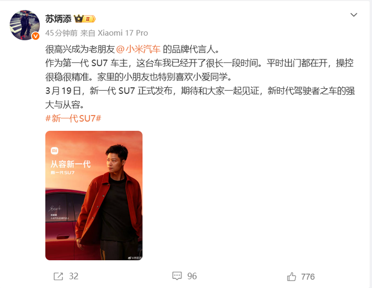车家号·0浏览·2026-03-17 11:18 · 北京PChome 3月16日消息,雷军通过个人微博正式官宣了小米汽车品牌代言人:苏炳添,而这位新代言人正是小米的老朋友兼初代SU7的真实车主,这一消息立刻引发全网热议。