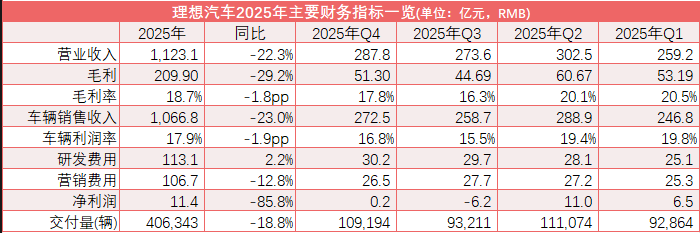 销量锐减,导致营收大幅缩水。去年理想营收1123亿元,同比骤降22.3%。虽然保住了“连续三年营收破千亿”,但高达22.3%的降幅,无异于刺耳的警报。