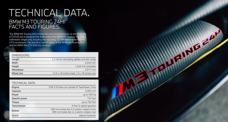 宝马M3 Touring 24H比宝马M4 GT3 EVO长200毫米,加上尾翼后高度也高出32毫米,两款赛车的技术参数完全相同。搭载的是P58赛用发动机,排量为2993cm³,可以输出最大功率590hp,峰值扭矩700牛米,匹配的是X-trac六速序列式变速箱,后驱。