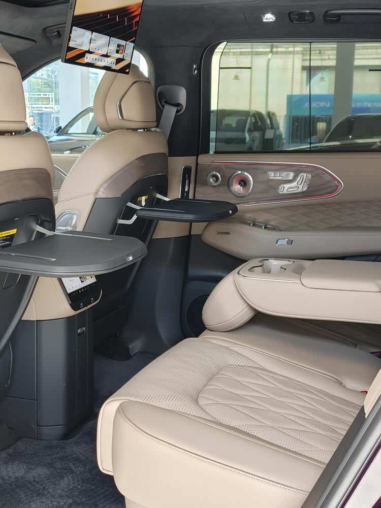 最舒服的当属第二排右侧的“伊姆斯躺椅”,可以调到137度的舒躺角度,配上电动腿托和脚踏,长途休息非常惬意。至于后排的电动遮阳帘、折叠小桌板、车载冰箱、17英寸的吸顶屏,以及那套拥有29个扬声器的Naim音响,懂的都懂,这些都是提升幸福感的神器。