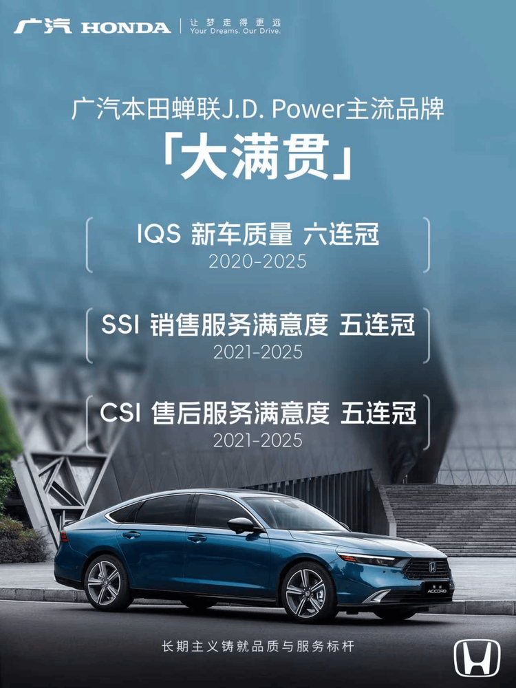 先从最硬核的“试金石”——J.D. Power说起。从2020年到2025年,广汽本田连续六年摘得中国新车质量研究(IQS)主流品牌第一名。这意味着,在长达六年的时间里,它的产品品质始终稳居行业前列。更难得的是,在销售服务满意度(SSI)和售后服务满意度(CSI)两项评选中,广汽本田也连续五年霸榜主流品牌第一。IQS、SSI、CSI三大奖项的全线蝉联,几乎可以称得上是行业“大满贯”,用数据说话,证明了它在质量与服务上的双重实力。