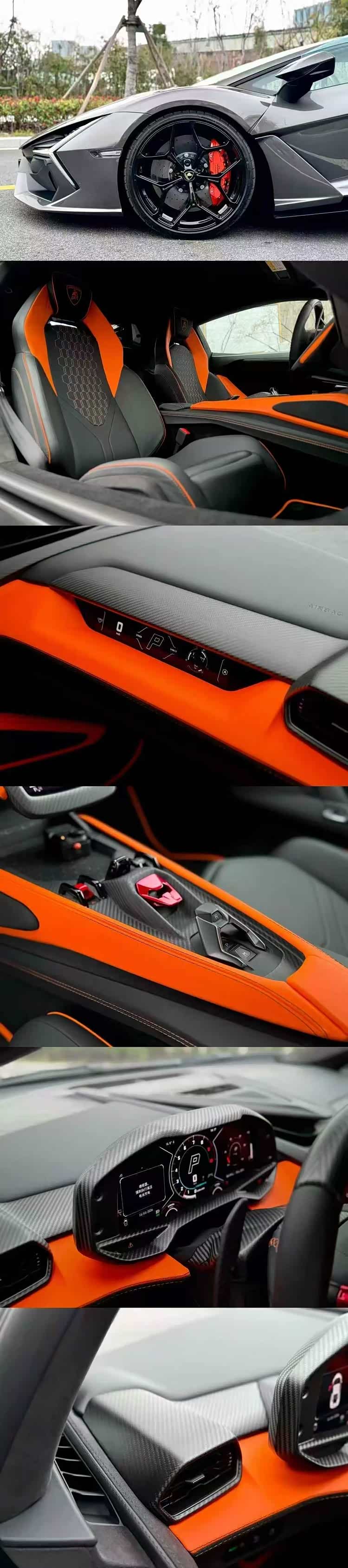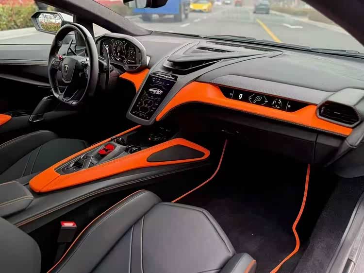 25年新款兰博基尼大牛revuelto,战斗灰外观/黑橙双拼内饰,选配:碳纤维多功能方向盘,哑光黑色排气管,CarPlay,乘客显示屏,底盘升降,电动座椅带加热,橙色卡钳,20/21寸亮黑色锻造轮毂等配置