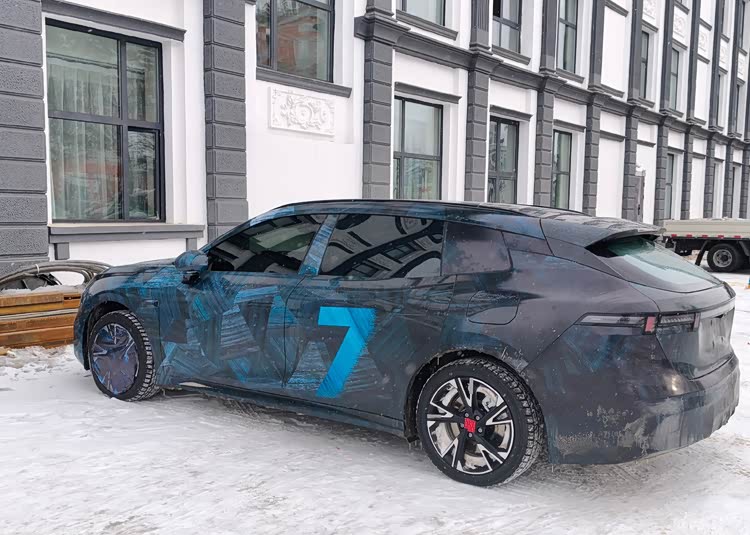 具体来看,前脸部分,上半部分当然和三厢版本保持一致,都是突出的机盖,分叉式的日行灯组及贯穿式的扁平远近光灯。前保险杠部分似乎略有不同,目前只看到梯形下格栅,没有看到三角形雾灯区进气道,也有可能是在伪装之下,大概率是进行了细微的差异化处理,同时,透过前风挡可以看到Hud抬头显示,悬浮式液晶屏等元素,不会变化,保持品牌的传统,车顶激光雷达不会缺席,显示了新时代车型的特征。