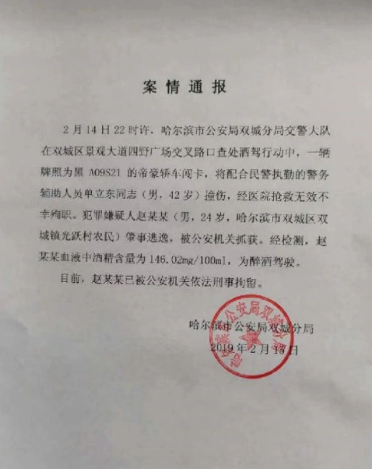 2019年2月14日21时20分许,在哈尔滨的一个路段里出现,醉酒男子赵玉林驾驶一辆吉利牌轿车遇到交警设置的车辆检测卡点;而疯狂的赵玉林选择直接闯卡!在其驶入第一个卡点时,交警随即示意其停车接受检查,但是赵玉林疯狂加速绕开拦截交警的第一道卡点;随后看到前方的第二个卡点时依然加速冲卡,结果直接撞上执勤交警单立东。