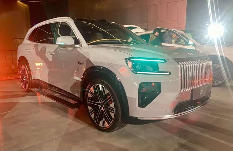 既然是新车首秀,那咱们还是先看颜值:极氪8X沿袭了品牌家族式设计美学,整体造型兼具力量感与科技感。其中,前脸的大尺寸直瀑式金属格栅与极氪9X一脉相承,气场十足;分体式灯组的“C”形日行灯线条犀利,点亮后极具辨识度,格栅两侧的导流槽能有效降低风阻,也增强了运动感。