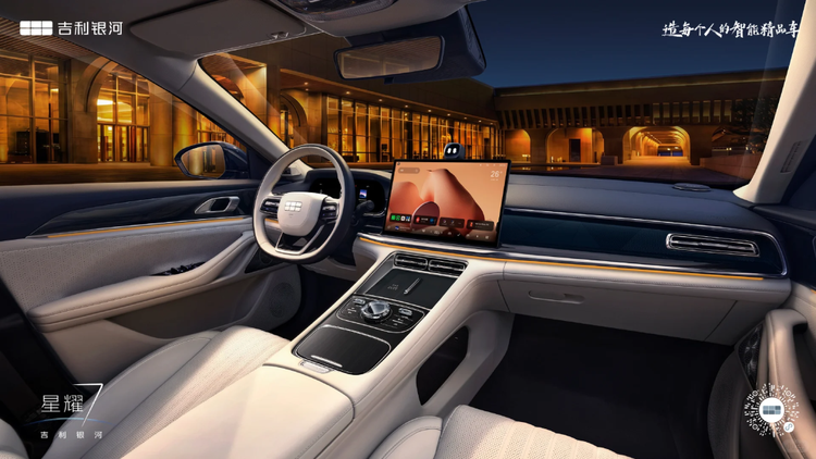 车身侧面,新车线条流畅,一条腰线从前大灯一直延伸至尾灯,车顶呈现出微微溜背效果,搭配传统机械门把手以及多辐条低风阻轮圈设计,令车辆看起来非常沉稳大气和修长。尺寸方面,新车长宽高分别为4958/1915/1505mm,轴距为2852mm。作为对比,星耀6长宽高分别为4806/1886/1490mm,轴距为2756mm。相比之下,新车整体体型更大。车尾部分,新车采用时下新能源车流行的贯穿式尾灯组设计,灯组中央镶嵌“GEELY”字母标识,夜间点亮后拥有极高的辨识度。另外,新车尾箱采用小鸭尾设计,配合后保险杠贯穿镀铬饰条,营造出不错的视觉层次感和精致感。
