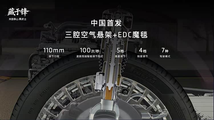 外观部分,泰山黑武士版纯黑车漆搭配全套熏黑套件营造暗藏锋芒的整体基调,玄镜万象格栅采用全镜面高光黑化工艺打造,周围景色在镜面上流转映照,隐喻侠者面对周遭繁杂而巍然不动的霸气;天地星芒轮毂经10道核心工序加工,采用专属PVD黑亮镀膜工艺提升品质,将“重”与“灵”完美融合,打造举重若轻之感。