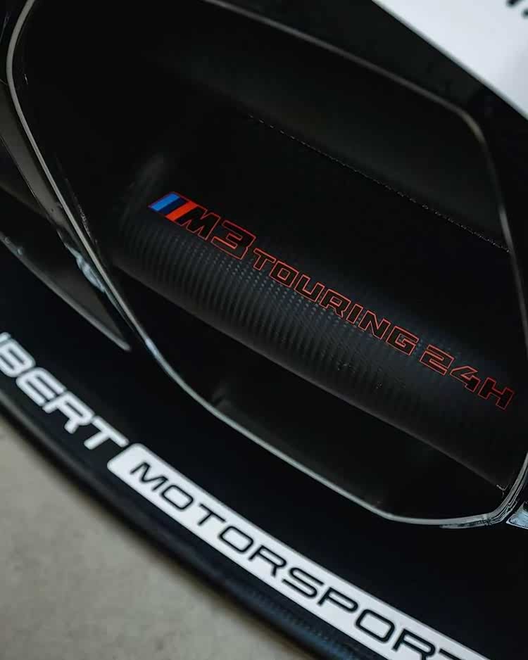 值得一提的是 宝马M3(参数|询价) Touring 24h全车覆盖件采用CFRP碳纤维增强塑料打造,轻量化与刚性拉满。为保留旅行车经典轮廓,后门改为装饰面板,无法开启。重新设计的前唇、侧裙、尾部扩散器与大型尾翼协同工作,高速下提供充足下压力,也让这台车的车身空气动力学无限接近M4 GT3 EVO赛车。