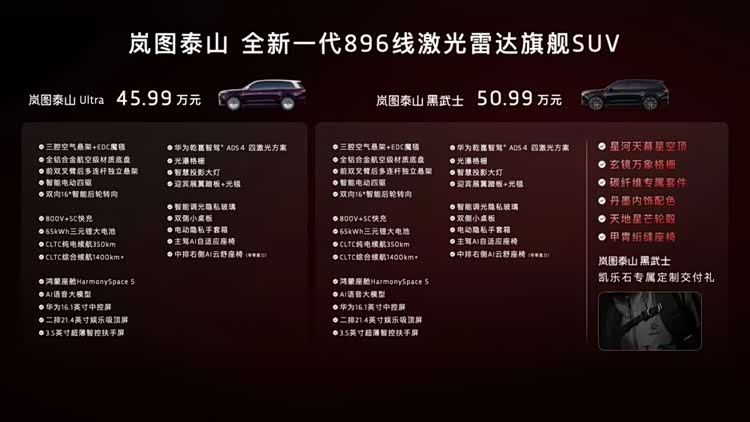 2026年3月17日,岚图汽车召开以“远见”泰山技术焕新发布会。岚图联合央视新闻,交出了一份极具分量的时代答卷,全新一代896线激光雷达旗舰SUV 岚图泰山(参数|询价)Ultra版正式启动量产交付,新车售价45.99万元。同时,岚图泰山黑武士版开启大定,新车售价50.99万元。岚图以惊人的速度,率先将顶尖的896线激光雷达量产装车。目前,全国展车及试驾车已全面到店。这不仅体现了岚图强大的体系力,也标志着岚图泰山Ultra及黑武士凭借“硬核机械+顶尖智驾”的双重护城河,重新标定了9系旗舰SUV的价值新高度,让世界看到,智慧出行的未来将由中国来定义。