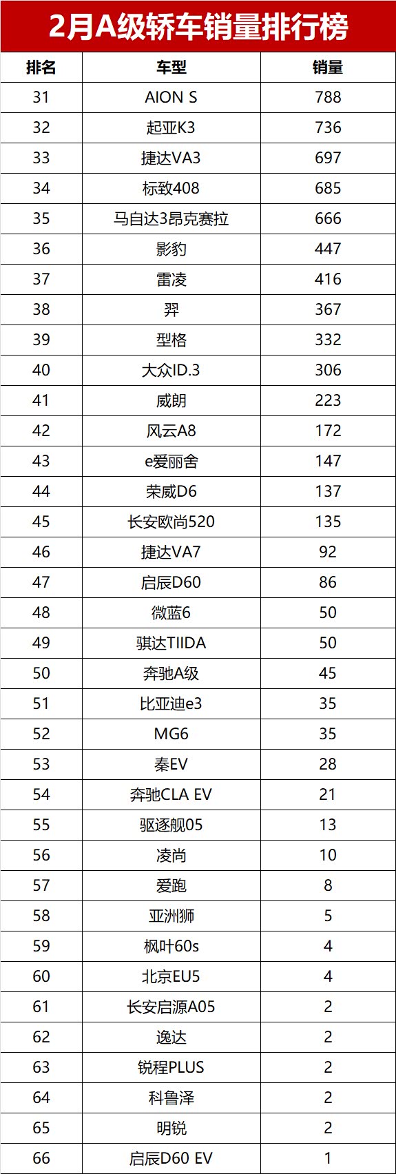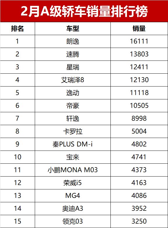 【2026年2月A级轿车零售销量排行榜】乘联会最新数据刚出炉,作为汽车编辑,直接给大家扒干货!2026年2月国内轿车市场实打实“开门遇冷”,受春节长假、新能源政策切换影响,销量同比、环比双双下滑。最受老百姓关注的A级轿车表现更拉胯,堪称“冰火两重天”——去年猛冲的A级新能源车彻底哑火,被唱衰的传统燃油车反而回暖,直接包揽前八,整个月销量破万的仅6款,还全是燃油车!不多废话,2月A级轿车销量榜完整版,看看你关注的车上榜没~