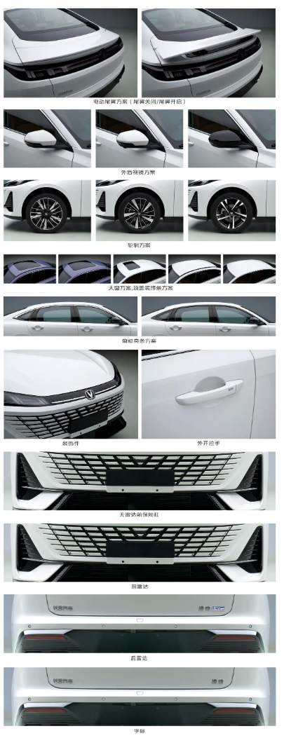 从申报图来看,逸动HEV在外观方面基本延续了燃油版车型的设计。前脸采用无边界前格栅,内部辅以点阵式元素并加入镀铬装饰,提升了精致感。车尾则配备电动扰流板、贯穿式尾灯组以及双边共两出排气装饰,整体造型动感时尚。