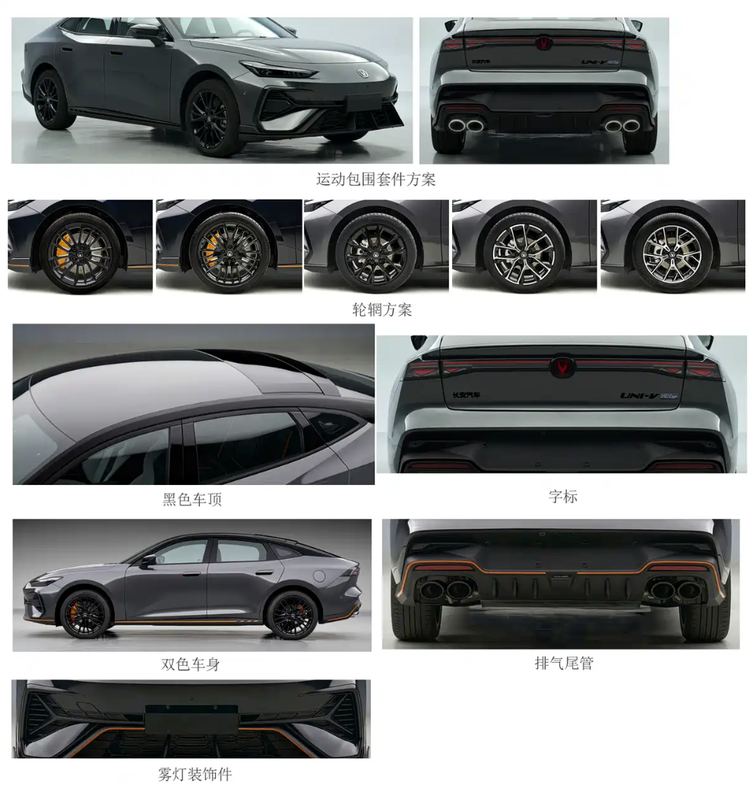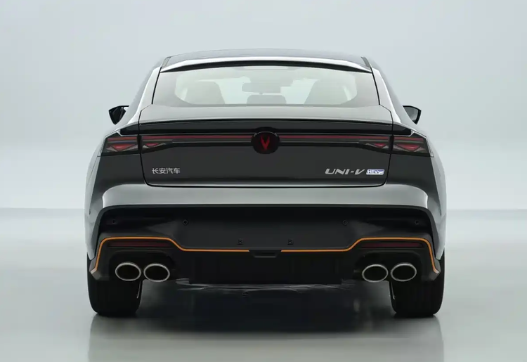 从申报图来看,长安UNI-V HEV整体延续了燃油版车型的运动化设计风格。前脸采用封闭式格栅搭配造型夸张的三段式进气口,视觉冲击力十足。车尾则配备双边共四出排气布局,并在细节处加入橙色线条点缀,配合贯穿式尾灯组,营造出丰富的层次感与运动氛围。