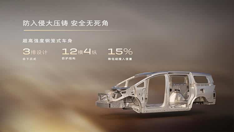 被动安全方面,新车采用潜艇级超高强度钢笼式车身,高强钢占比78%,配合12横4纵超强防护结构及防入侵大压铸技术,车身扭转刚度提升15%,碰撞乘员舱侵入量降低15%。此前该车已通过托底后追尾叠加跌落极限试验,获权威认证。