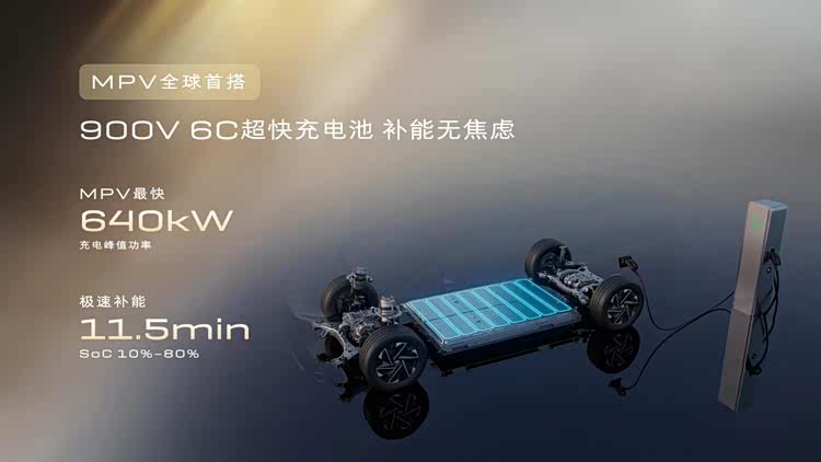 至境世家纯电版是全球首款搭载900V 6C超快充电池的MPV车型,峰值充电功率达640kW,创下MPV市场最快充电速度纪录。电量从10%充至80%仅需11.5分钟,有效缓解用户补能焦虑。新车匹配96kWh大容量电池,综合续航达601km,兼顾安全与实用空间。