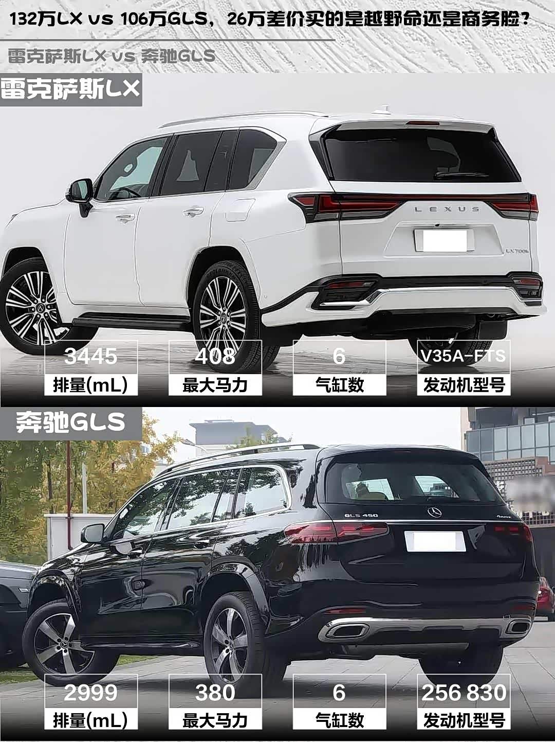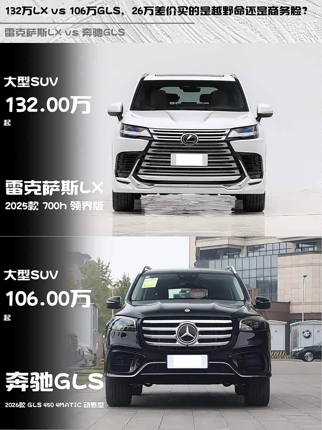 最近后台好多人在问:百万级豪华SUV到底选 雷克萨斯LX(参数|询价) 2025款 700h 领界版还是奔驰GLS 2026款 GLS 450 4MATIC 动感型?今天直接拉参数表给你们盘明白!🔥