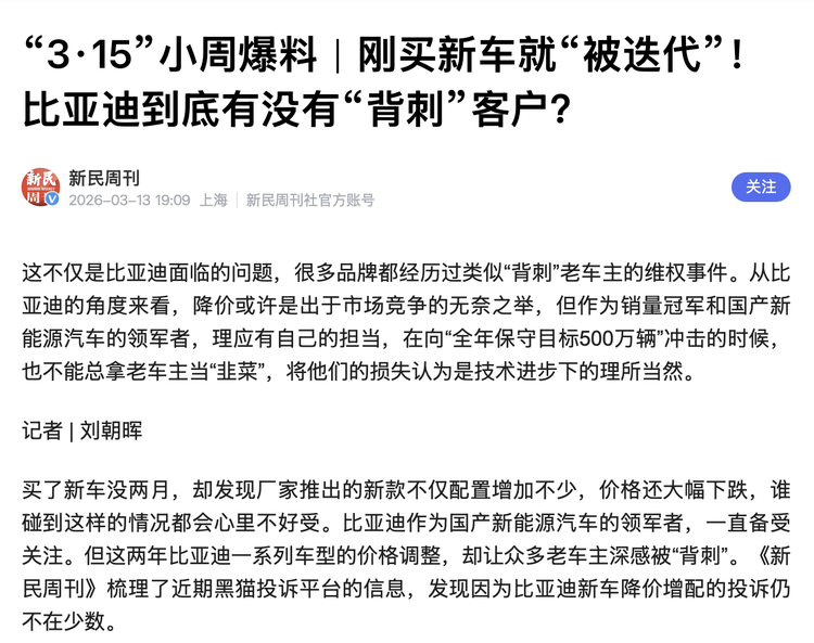 据新民周刊报道,2023年,比亚迪推出多款“冠军版”车型,核心策略就是降价增配。比如汉EV冠军版起售价下调2万元,同时升级了DiLink 4.0车机、FSD可变悬架等功能。 刚买老款不久的车主们纷纷表示:“购车即过时,我们成了最大的输家。” 比亚迪的快速迭代策略让老车主们措手不及,也让他们对比亚迪的感情从热爱转为失望。
