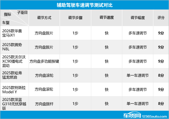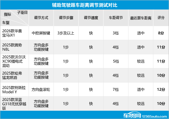 在辅助驾驶跟车距离调节测试对比中,特斯拉Model Y以满分成绩领跑,其不仅支持7档车距调节,而且最近跟车距离适中,整体表现出色。相比之下,华晨宝马iX1的表现相对较差,不仅调节步骤复杂,而且车距调节仅为3档,导致其在该项测试中排名垫底。