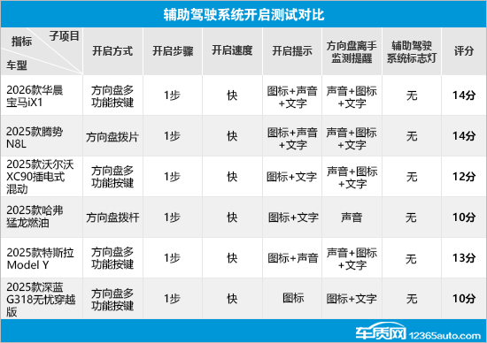 在辅助驾驶系统开启测试对比中,2026款华晨宝马iX1(以下简称:华晨宝马iX1)、2025款沃尔沃XC90插电式混动(以下简称:沃尔沃XC90)、2025款特斯拉Model Y(以下简称:特斯拉Model Y)以及2025款深蓝G318无忧穿越版(以下简称:深蓝G318)均采用方向盘多功能按键开启;2025款腾势N8L(以下简称:腾势N8L)采用方向盘拨片开启;2025款哈弗猛龙燃油(以下简称:哈弗猛龙)采用方向盘拨杆开启。开启步骤方面,6款车型均只需1步,并且开启速度快,日常使用十分便捷。开启提示方面,华晨宝马iX1和腾势N8L提供三种提示方式,深蓝G318只有一种提示方式,其余车型均提供两种提示方式。此外,6款车型均配备方向盘离手监测提醒功能,除哈弗猛龙和深蓝G318外,其余车型都具备三种提醒方式。较为遗憾的是,6款车型均未配备辅助驾驶系统标志灯。