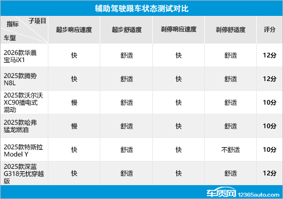 在辅助驾驶跟车状态测试对比中,华晨宝马iX1、腾势N8L以及深蓝G318均获得满分,起步和刹停过程中的响应速度和舒适度都能令人满意。相比之下,沃尔沃XC90和哈弗猛龙由于起步响应速度较慢,导致出现失分情况,特斯拉Model Y的失分点在于刹停舒适度欠佳,有待提升。