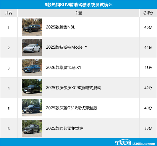 通过此次横评可以发现,腾势N8L在多项测试中获得满分,总评分达到46分,排名第一;特斯拉Model Y和华晨宝马iX1的表现同样可圈可点,以44分和43分的成绩紧随其后;沃尔沃XC90和深蓝G318虽然在部分测试环节存在丢分情况,但最终成绩也基本令人满意。至于哈弗猛龙,由于在方向盘离手监测提醒以及辅助驾驶车速调节幅度存在明显减分情况,导致其最终评分为38分,排名垫底。当然,参与横评的6款车型在辅助驾驶系统测试中或多或少都存在一些问题,希望厂家在后续的车型升级中持续优化改进,为车主带来更加安全便捷的辅助驾驶体验。