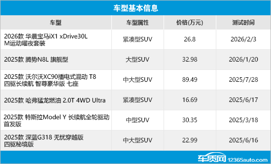 本期选取的6款车型包括1款大型SUV、2款中大型SUV、1款中型SUV和2款紧凑型SUV,涵盖自主、合资和进口品牌,并且燃油车型和新能源车型也都有涉及。