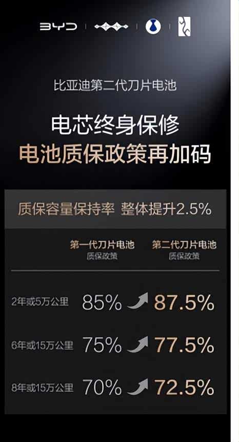 依托于技术带来的产品底气,比亚迪第二代刀片电池将质保政策全面加码,为用户送上安心保障。相较于第一代刀片电池,第二代产品将质保的「容量保持率」整体提升2.5%,在6年或15万公里质保期内,电池容量低于77.5%即可享受免费包换服务;同时,电芯更是提供「终身保修」权益,以行业领先的质保标准,打消用户的用车顾虑。