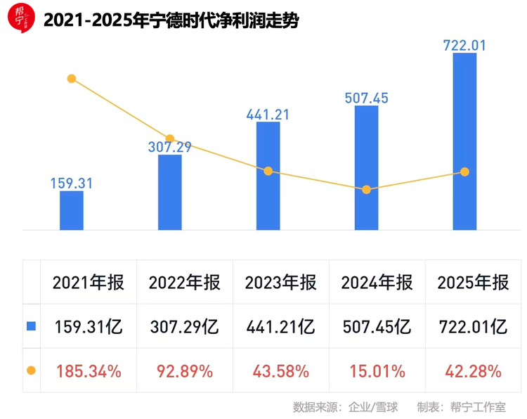 2025年,宁德时代大赚722亿元,同比增长超40%。据红星资本局统计,这一数字超过13家A股整车上市公司利润总和(不含比亚迪)。
