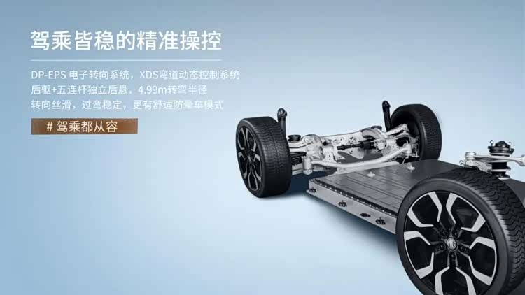 底盘层面,MG ES5采用前麦弗逊+后多连杆独立悬架,后置后驱布局带来接近50:50的前后轴荷比。