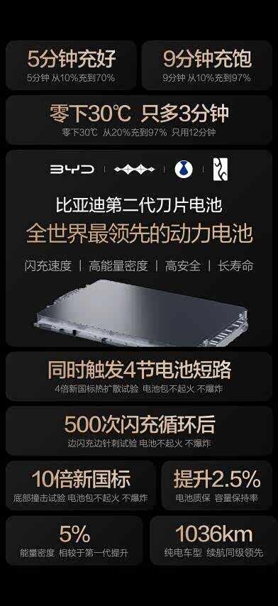 2026年3月5日,比亚迪正式发布第二代刀片电池,凭借“常温5分钟充好、9分钟充饱,零下30度低温仅多3分钟”的闪充表现,硬核破局行业痛点,一举攻克行业“充电慢”“低温充电难”两大痛点,更以高能量密度、长寿命、高安全的全能优势,重新定义全球领先动力电池标准。针对用户普遍关注的“闪充是否影响电池寿命与安全”的核心疑虑,比亚迪第二代刀片电池以创新技术、严苛测试与升级质保给出硬核答案,实现闪充与耐用、安全的完美兼得。充电速度与电池寿命的平衡,一直是动力电池行业的技术难题,大功率闪充产生的热量往往会对电池寿命造成影响。为破解这一矛盾,比亚迪第二代刀片电池打造专属“锂离子高速通道”,并搭载“全温域智能热管理系统”,从源头上减少闪充产热,同时实现热量的快速、均匀散出,从技术层面将闪充对电池寿命的影响降至最低,真正实现“闪充与长寿命兼得”。依托于技术带来的产品底气,比亚迪第二代刀片电池将质保政策全面加码,为用户送上安心保障。相较于第一代刀片电池,第二代产品将质保的「容量保持率」整体提升2.5%,在6年或15万公里质保期内,电池容量低于77.5%即可享受免费包换服务;同时,电芯更是提供「终身保修」权益,以行业领先的质保标准,打消用户的用车顾虑。