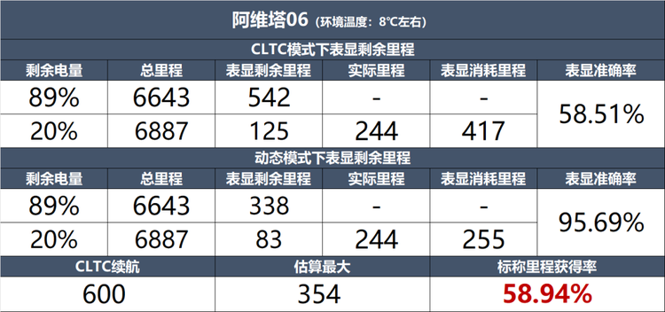 这辆车搭载一块72.88千瓦时宁德时代磷酸铁锂电池,CLTC标称续航里程600公里。在北京初春平均8摄氏度左右的气温下测试,充电至90%,CLTC显示续航里程542公里,动态续航显示里程338公里。行驶到电量剩余20%时,CLTC显示续航里程还剩125公里,动态续航剩余里程83公里。CLTC消耗里程417公里,动态消耗里程255公里,实际行驶里程244公里。计算得出CLTC模式表显准确率为58.51%,动态模式表显准确率为95.69%。