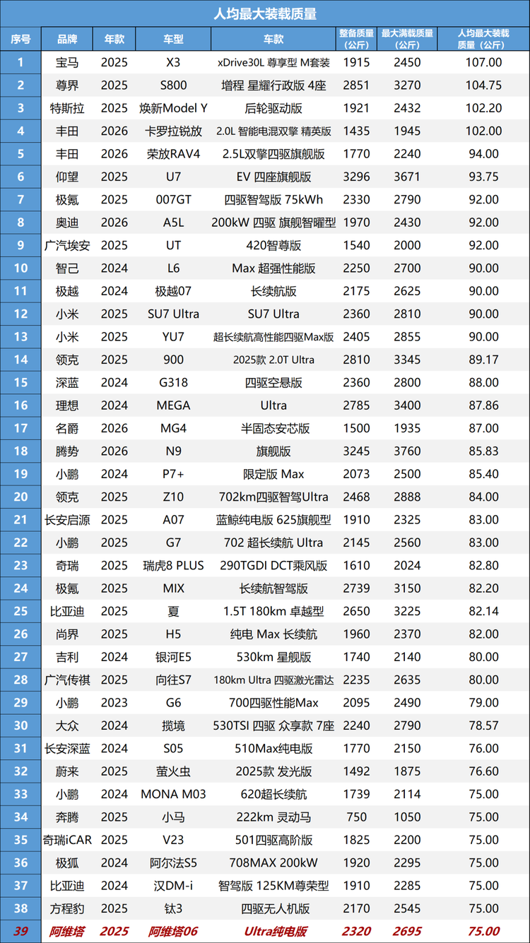 我们这辆车的整备质量为2320千克,最大满载质量为2695千克,计算得出这辆阿维塔06 Ultra纯电版的人均最大装载质量为75千克,刚刚符合标准。