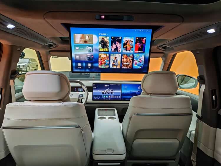 这两块屏幕在视觉上与内饰门板融为一体,可在上面控制吸顶屏的开合角度、调节座椅与空调、选择音乐播放的曲目与音量大小等能力,还能提供「后排开门预警」影像,进行视野补盲。
