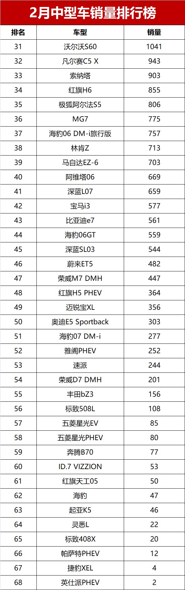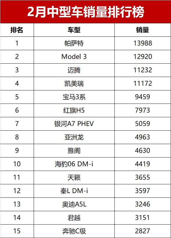 2月中型车市场基本上是燃油车主场,前六名仅1款新能源。 大众帕萨特(参数|询价)以13988辆拿下销冠,德系老将的淡季韧性拉满;紧随其后的特斯拉Model 3,以12920辆排第二,是唯一破万的新能源,也算给新能源挽了点颜面。