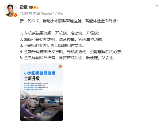 新一代小米SU7标配澎湃智能座舱 95%功能语音可控