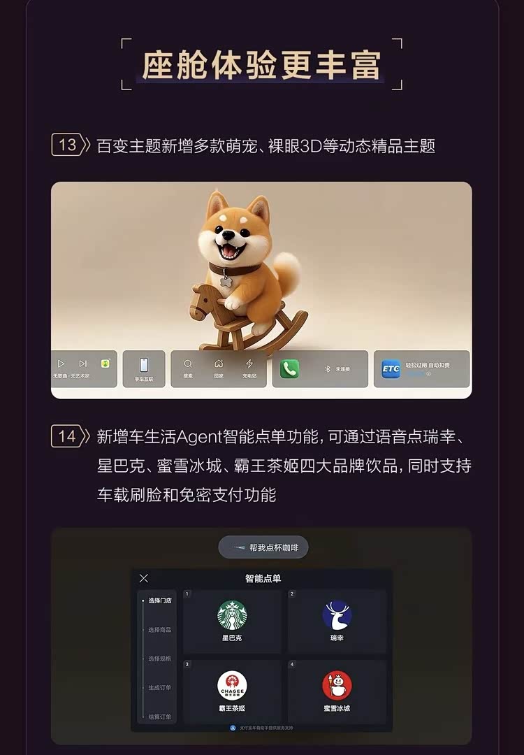 智能座舱体验也迎来全面焕新:新增的多款萌宠、裸眼3D动态主题,让车内氛围更具个性化,更有温度。车生活Agent智能点单功能,支持语音购买瑞幸、星巴克等四大品牌饮品,并通过车载刷脸或免密支付完成交易,将用车场景延伸至生活服务。锁车音效支持用户自定义,无论是家人的笑声还是宠物的叫声,都能成为闭锁时的专属彩蛋。此外,电子木鱼小游戏、预约凌晨升级、HUD账号记忆等功能的加入,无不体现着品牌对用户细微需求的洞察与用心回应。
