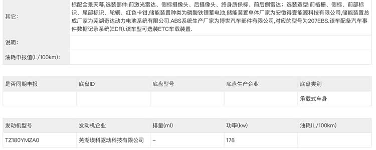 动力方面,根据申报信息显示,新车将搭载一台由芜湖埃科驱动科技有限公司提供的TZ180YMZAO驱动电机,电机最大功率178kW,并非同体积功率密度顶尖的产品。电池则选用了安徽得壹能源科技有限公司生产的磷酸铁锂电池,目前风云A9还暂时没有公布具体的续航参数。另外值得一提的是,新车后续还有望推出增程版车型,进一步丰富产品矩阵,覆盖更多消费需求。