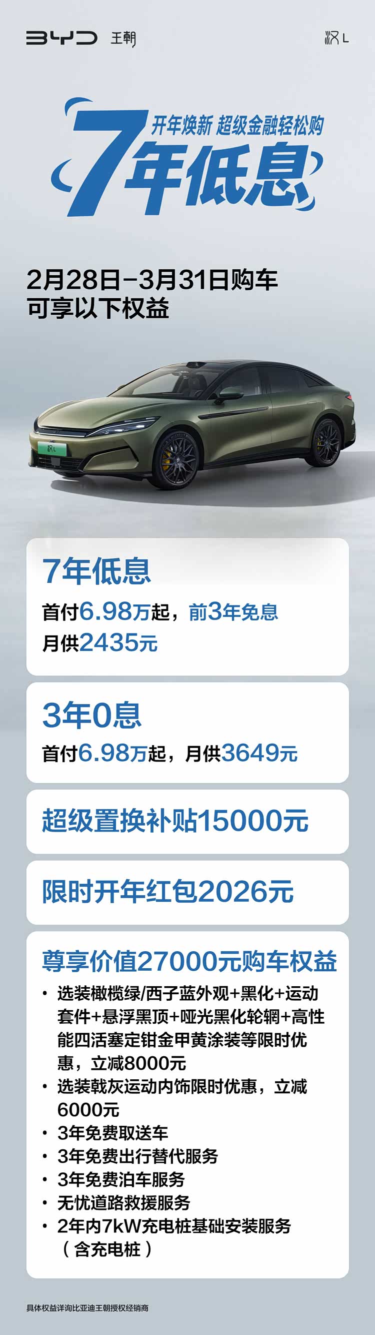 除金融礼遇外,汉 L 更推出多重购车福利:置换购车可享至高15000元超级置换补贴,限时领取2026元开年现金红包,并获赠价值27000元的尊享购车权益包。权益包涵盖外观与内饰选装限时优惠、3年免费取送车与泊车服务、2年内7kW充电桩基础安装权益等。其中,外观套装(含橄榄绿/西子蓝车色、悬浮黑顶、黑化运动套件等)限时立减8000元,戟灰运动内饰立减6000元,为追求个性化的车主提供了绝佳的入手时机。