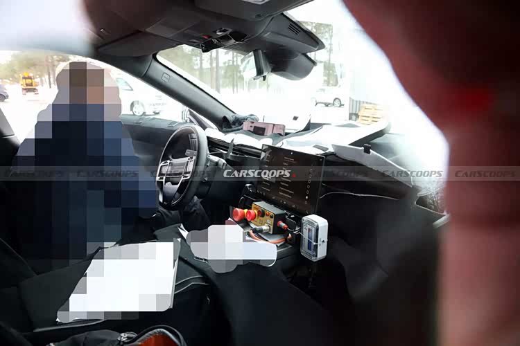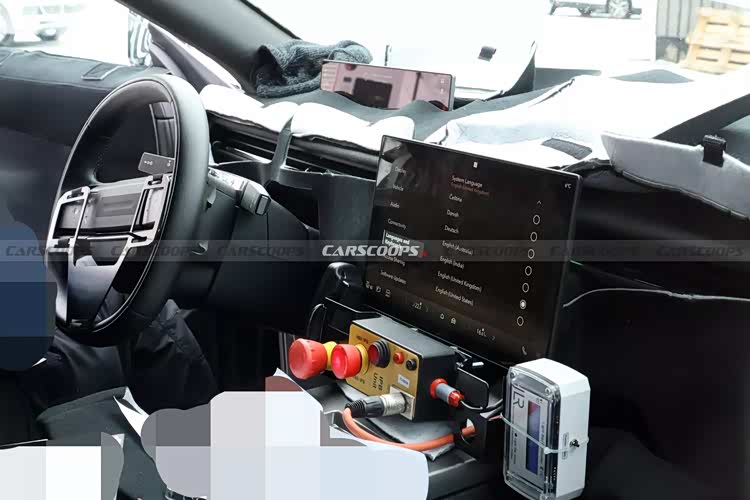 具体来看,整个内饰最为核心的当属悬浮的液晶屏,虽然看起来很凑合,但界面已经初具雏形,应该是最终的量产版本正在投入测试,因此这一部分不会和量产车型有出入。与此对应的是位于中控台面上方的悬浮式仪表盘,组成了错落式的双屏系统,尺寸不大,显得相对克制。由此而来,中控台面是相对平直的造型,倒也算延续了揽胜家族的传统,贯穿式的空调出风口已经清晰可见,屏幕下方有着突出的造型,不知道是否会保持一些物理按键。