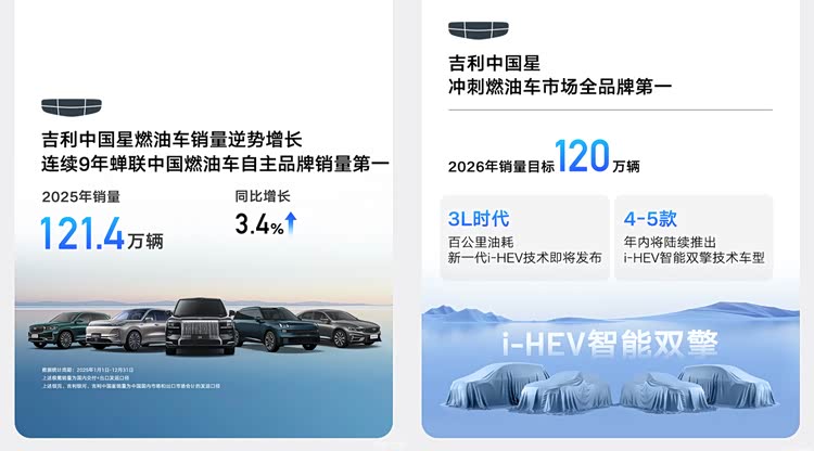 燃油车在国内仍然有很大的需求,而吉利中国星燃油车在去年收获了121.4万辆的成绩,同比增长3.4%,其中吉利星越L等车型的表现尤为抢眼,今年会陆续带来i-HEV智能双擎技术的车型。2026年的销量目标是稳定局面,所以依旧是120万辆的标准。