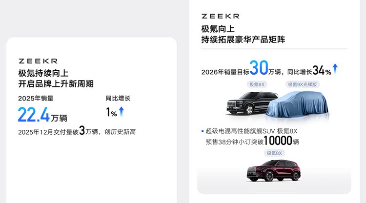 咱们再来看看旗下几个品牌的情况。极氪2025年销量22.4万辆,微涨1%;不过在去年年底的时候,销量超3万辆,创品牌历史。今年定下了30万辆的目标,包括刚刚预售的极氪8X都会为之发力。