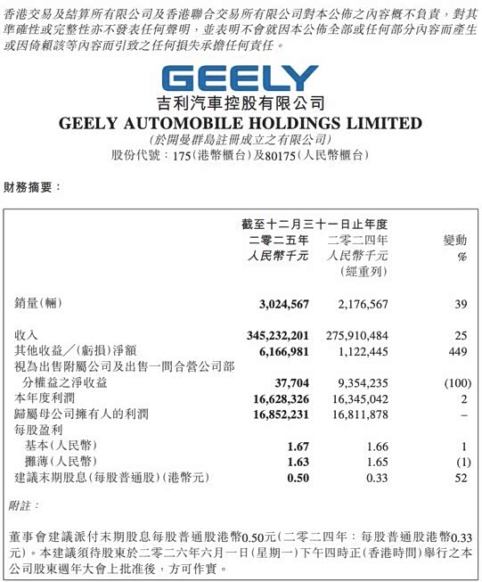 吉利汽车公布了2025年的业绩报告:全年总营收3452亿元,同比增长25%;核心归母净利润144.1亿元,同比增长36%;毛利总额573亿元,同比提升25%;全年总销量302.5万辆,同比增长39%。能够看到,吉利汽车2025年保持了强劲的上升态势。