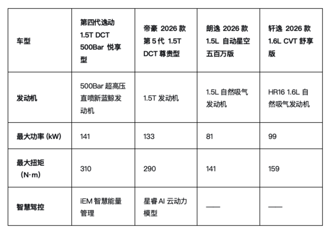 轩逸搭载的1.6L自然吸气发动机最大扭矩仅159N·m,实际驾驶中动力输出偏弱,高速超车时需要预留较长时间。朗逸的1.5L自吸发动机扭矩更是只有141N·m,仅能满足基本代步需求。帝豪的1.5T发动机虽然达到290N·m扭矩,但仍与逸动存在差距。更值得一提的是,逸动独家配备“iEM智慧能量管理系统”,能够智能识别驾驶工况,确保行驶平顺性,提升乘坐舒适度,这项配置在帝豪、朗逸、轩逸上均未出现。