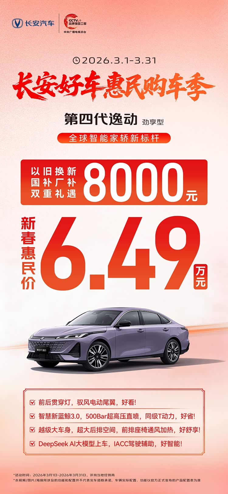 现在长安第四代逸动全系优惠后6.49万起,它以颠覆性的设计语言、越级的动力表现、智能的座舱体验、舒适的乘坐空间和全面的安全防护,重新定义了国民家轿的价值标准。当你发现用同样的预算甚至更少的投入,就能获得全面超越传统合资车型的产品体验时,答案已经不言而喻。这正是技术进步带来的普惠价值,也是长安逸动这样的经典车型能够持续引领市场的根本原因——始终以用户需求为导向,不断超越期待。