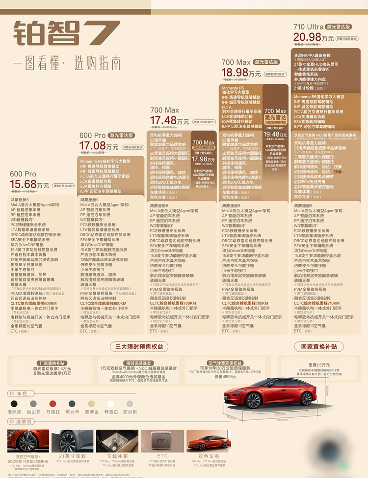 铂智7在辅助驾驶方面的配置比较扎实,搭载了Momenta R6飞轮大模型高阶辅助驾驶系统,全车集成了多个传感器,形成了全面的感知体系。这套系统采用一体融合式的端到端大模型,能够支持城市与高速路段的高阶辅助驾驶,在复杂路况下能为驾驶员提供一定的辅助,减轻驾驶负担。除此之外,铂智7还配备了双腔空气弹簧,这种配置能实现车身高度与悬架软硬的独立调节,应对不同路况时更加灵活。加上“智能预瞄”功能的加持,车辆能够预先识别前方路况,主动调整悬架状态,让行驶过程更加平稳,无论是颠簸路段还是高速行驶,都能带来不错的乘坐体验。